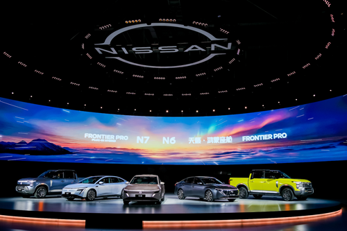 车型亮相,从左至右:Frontier Pro PHEV、N7、N6、天籁·鸿蒙座舱、Frontier Pro